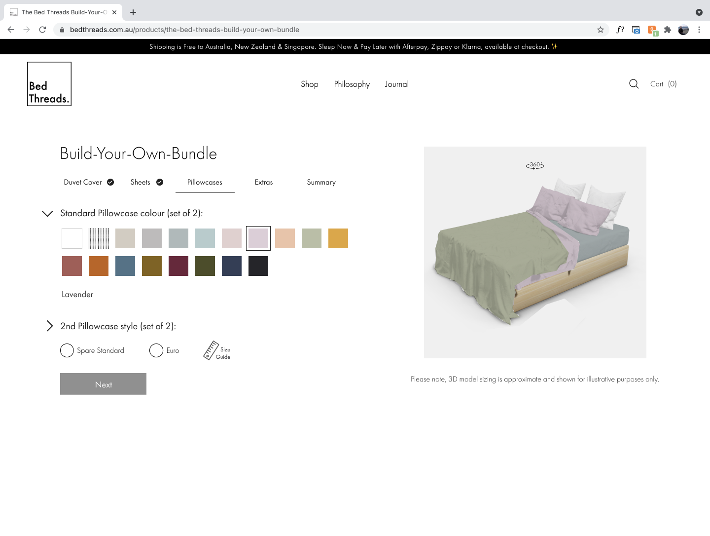 The most MVP feature, this interactive game-like experience applies colours to a rendered set in real-time. Simple is better in a minimalist aesthetic, while intuitively guiding users through a complicated journey of creating a custom bed set order from their favourite choice of colours, sizes, and add-ons.